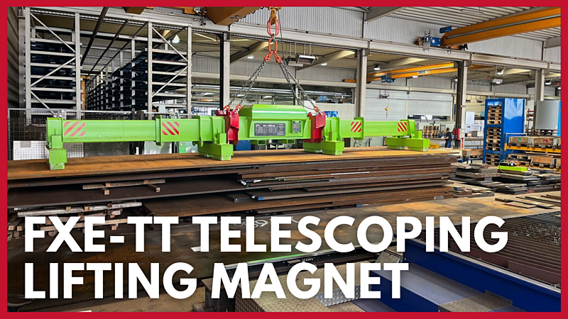 See the FXE-TT Telescoping Lifting Magnet from Flaig Magnetsysteme in action, available in North America through Industrial Magnetics. This demo highlights how the FXE-TT safely and efficiently lifts long steel sheets and plates using electro-permanent magnetic cross beams and hydraulic telescoping arms. Designed for demanding applications, it handles loads from 9-1/2 to over 50 feet with precision and balance. With radio remote control operation, operators can easily adjust magnet modules and lift from a safe distance, improving both productivity and safety.